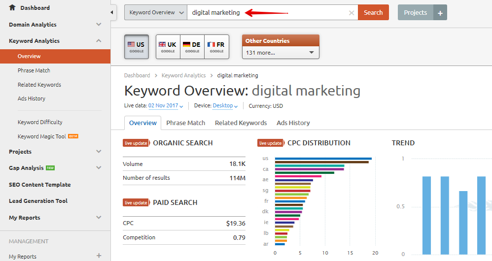 Pay per click advertising provides digital marketers with a reliable way of dominating the search results for targeted keywords. One of the most common challenges of PPC is targeting the right keywords for a high return on investment. A trial and error approach to PPC can be ineffective and ultimately expensive. SEMRush gives you the ability to find out your paid search competitors, track down their ads and even generate PPC keywords ideas for your advertising.